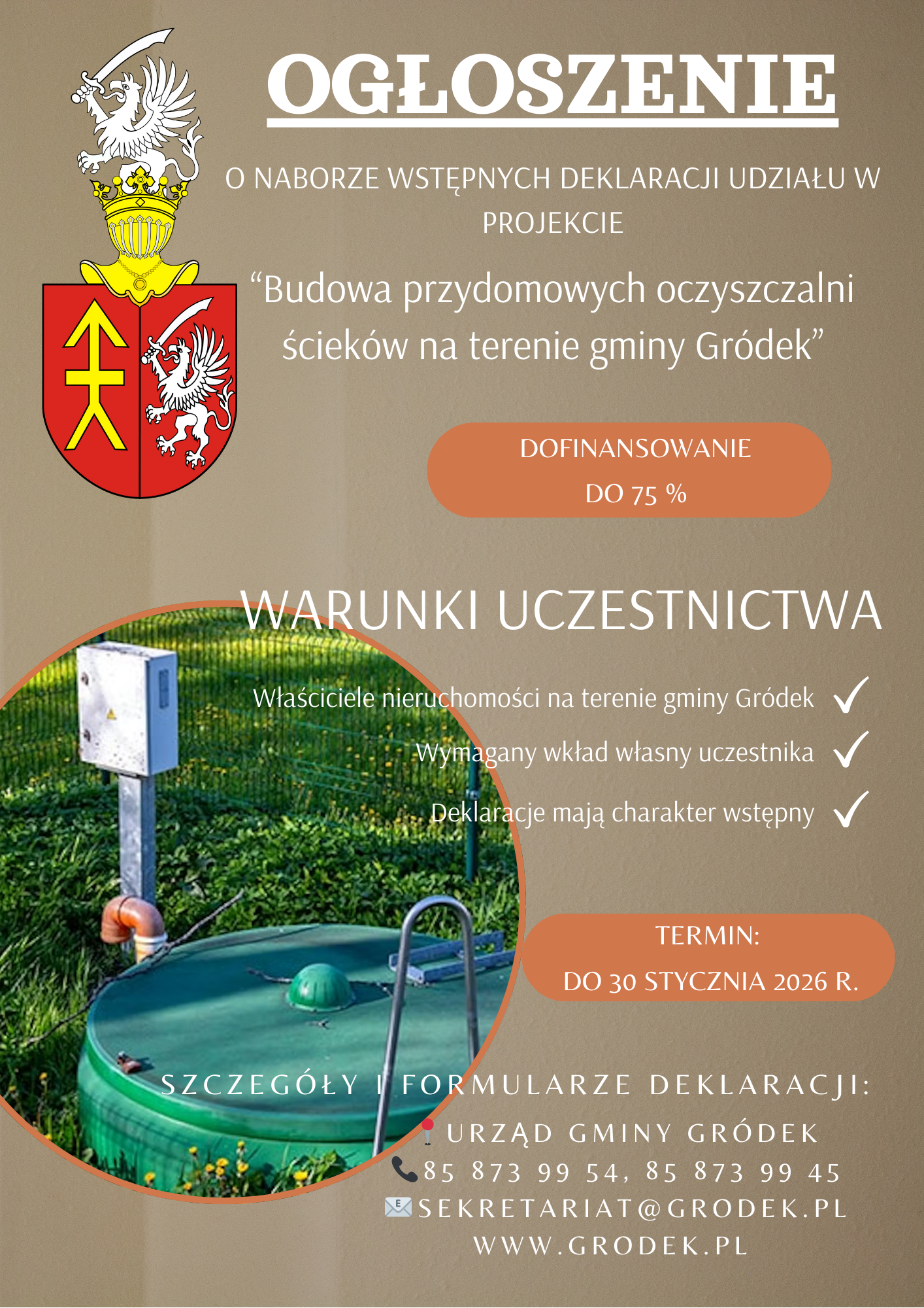 Wójt Gminy Gródek serdecznie zaprasza mieszkańców Gminy Gródek – będących właścicielami lub współwłaścicielami nieruchomości – do zgłaszania wstępnych deklaracji uczestnictwa w projekcie dotyczącym budowy przydomowych oczyszczalni ścieków.