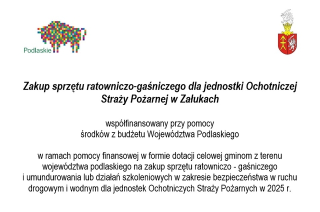11 lipca 2025 r. Wójt Gminy Gródek Wiesław Kulesza przekazał jednostce Ochotniczej Straży Pożarnej w Załukach nowe wyposażenie, w skład którego wchodzą 4 kompletne zestawy aparatów ochrony dróg oddechowych z maskami i butlami kompozytowymi.